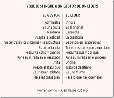 No es lo mismo gestionar que liderar. Si se comparan las diferencias entre las prácticas de dirección/gestión y las de liderazgo (ver cuadro) se pueden observar las razones por las cuales la gestión está asociada más al rendimiento y el liderazgo al compromiso, aunque ambas estén vinculadas a los resultados finales y a un impacto directo sobre los empleados, el análisis es complementario y diferente.