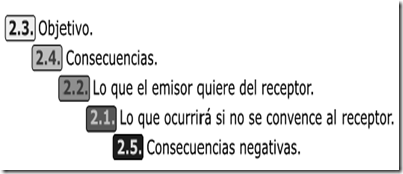2.4. Consecuencias de 2.2 que llevan a conseguir el objetivo elegido en 2.3. Escribir los beneficios para el receptor. Es el desarrollo de la exposición del mensaje. Consiste en sabiendo lo que el emisor quiere que ocurra (punto 2.2) y los objetivos del receptor (punto 2.3) enlazarlos-relacionarlos en términos positivos, evitando expresiones negativas. Es como el típico caso de la botella medio llena o medio vacía, aquí se quiere siempre la visión de medio llena.